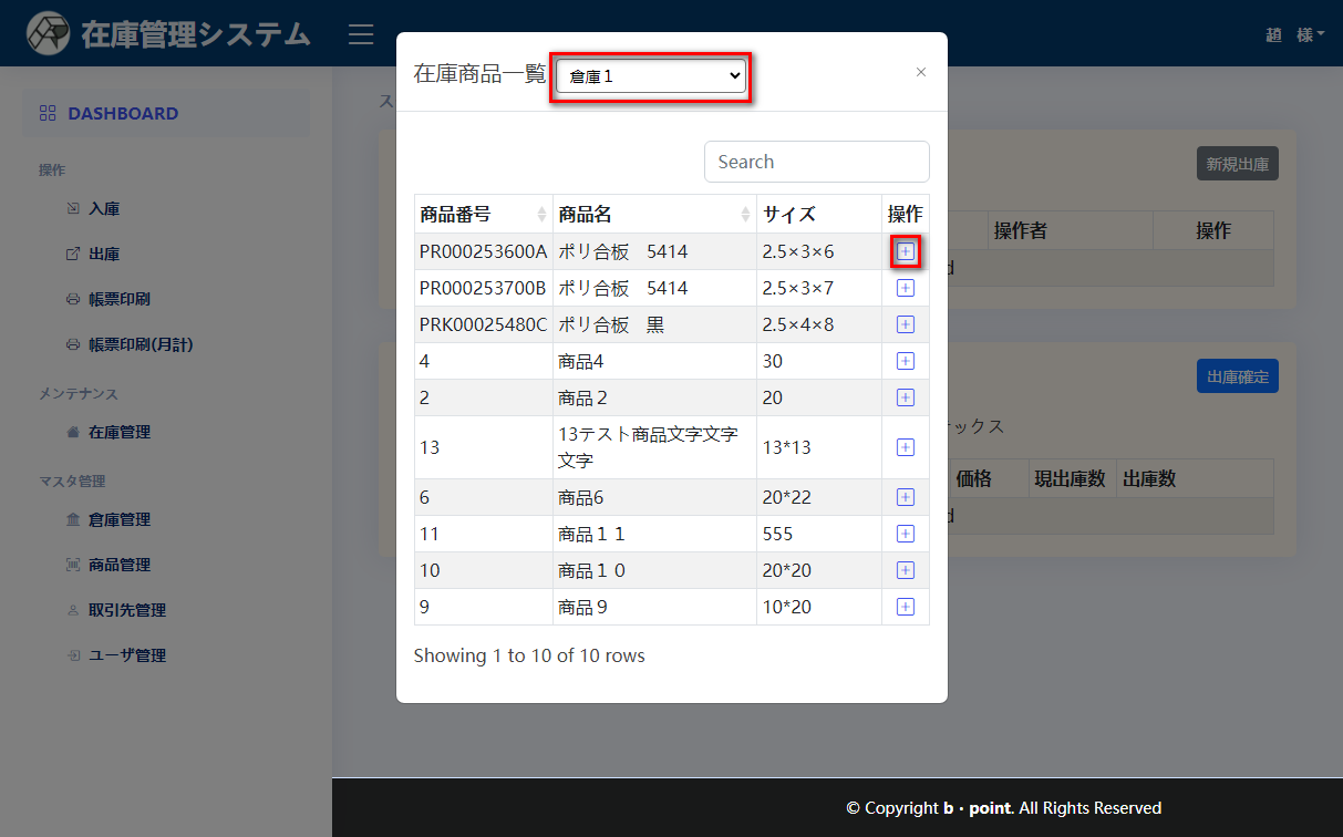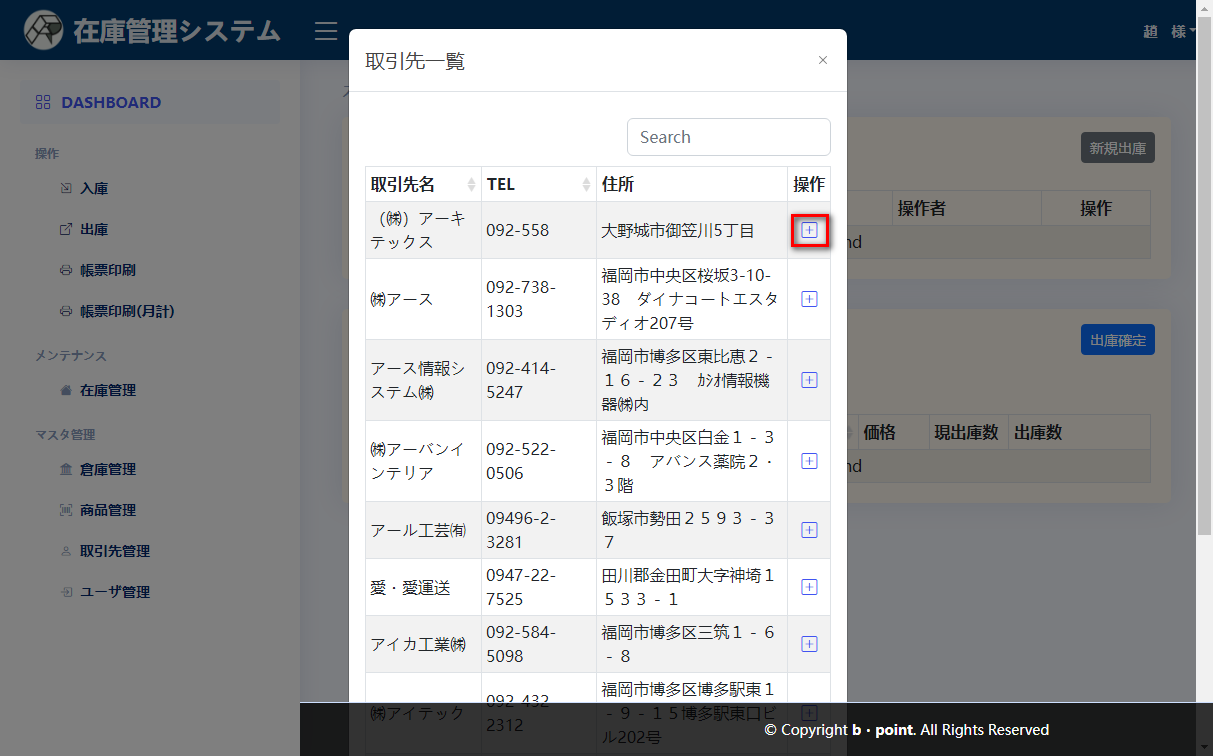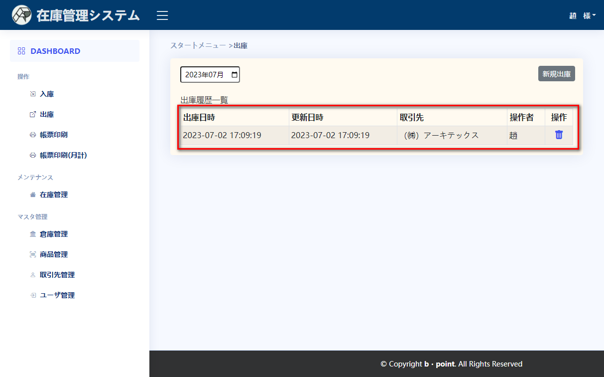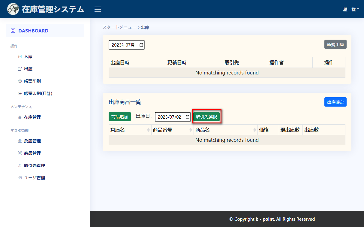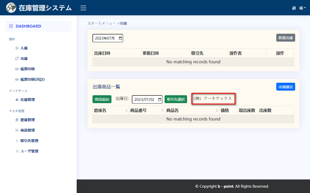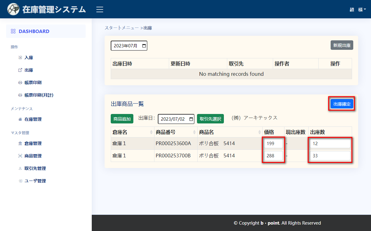出庫新規登録先に商品管理と倉庫管理画面で商品と倉庫を登録すること取引先を先に登録すること対象月を選択して、新規出庫ボタンを押す取引先選択ボタンによって、取引先を選択する商品追加ボタンによって、商品を追加する(入庫を参照する)商品価格と出庫数を入力して、出庫確定ボタンを押す登録された出庫データは、出庫履歴一覧に表示されます。