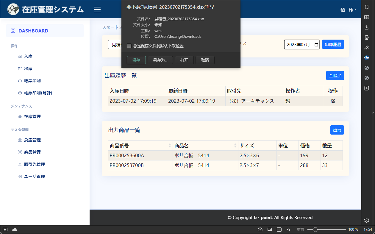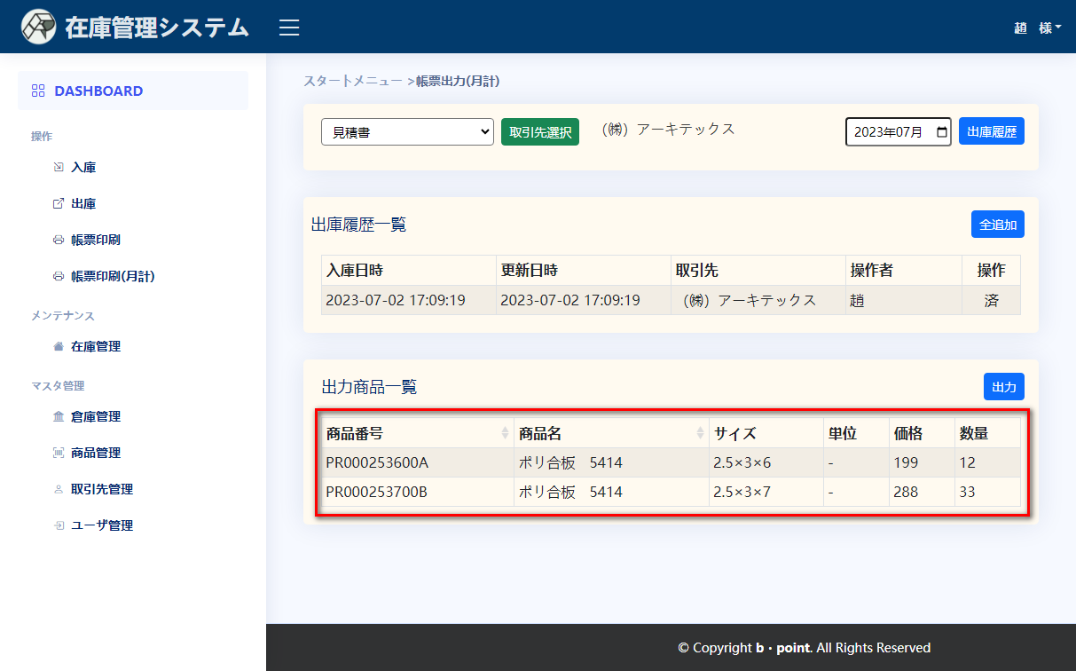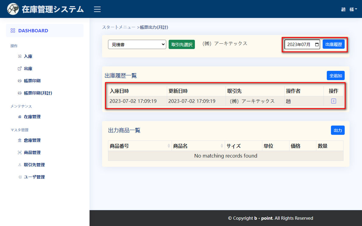 帳票出力(月計)出力する帳票を選択し、取引先を選択する対象月を選択して、出庫履歴ボタンを押下し、出庫履歴が表示されます出庫履歴を選択して、出庫商品が出庫商品一覧に表示されます出力ボタンによって、Excelファイルがダウンロードできます